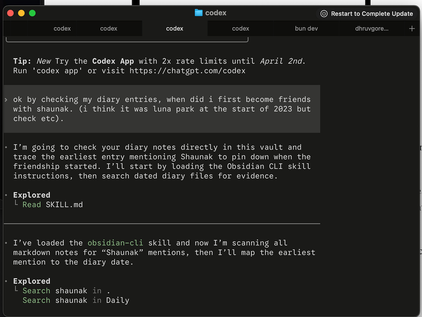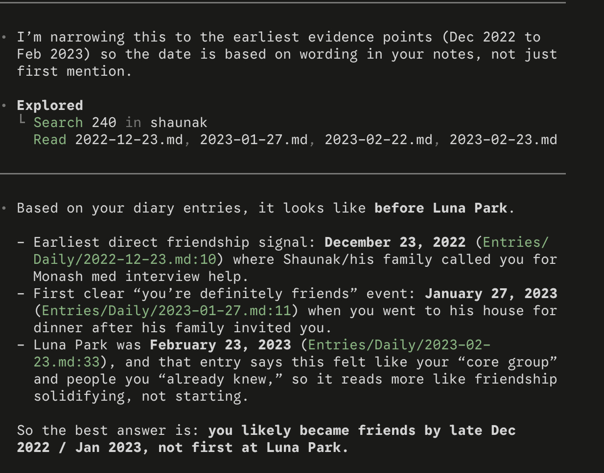 This also positioned Obsidian to take full advantage of the rise of AI agents, which easily access your notes and edit them via the terminal. It’s now trivial to query my past journal entries and extract insights, for example when I was researching when Shaunak and I first met: